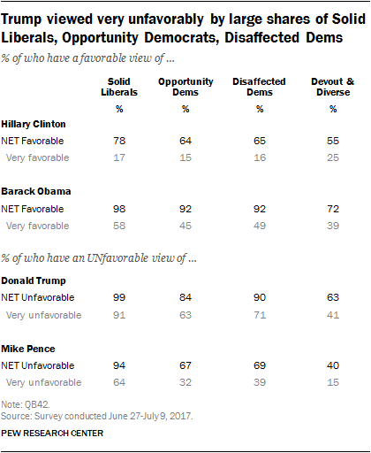 Solid Liberals have almost unanimous (99%) unfavorable views of Trump, including fully 91% who express a very unfavorable view. Wide majorities of Opportunity Democrats (84%) and Disaffected Democrats (90%) also express negative views of Trump, including majorities who have very unfavorable views.