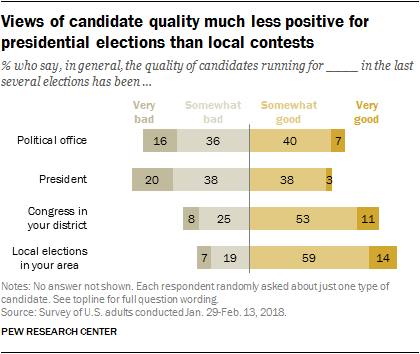 But the public offers more positive views of those running for offices closer to home: 64% say the quality of candidates running for Congress in the last several elections in their district has generally been at least somewhat good, while nearly three-quarters (73%) rate candidate quality in local elections (such as for mayor or county government) positively.