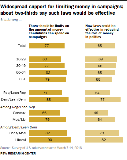 A wide majority of Americans continue to believe that there should be limits on the amount of money political candidates can spend on campaigns: Roughly three-quarters (77%) feel that such limits are appropriate. A somewhat smaller majority (65%) think that new campaign finance laws could be effective in limiting the amount of money in political campaigns. These overall views are little changed from 2015.