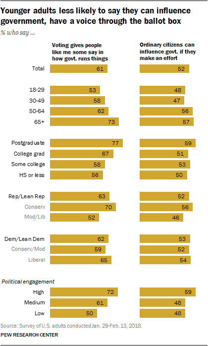 The view that voting gives people some say increases with age; while just 53% of adults under 30 say this, that compares with nearly three-quarters of those 65 and older (73%). This age gap is seen in both parties.