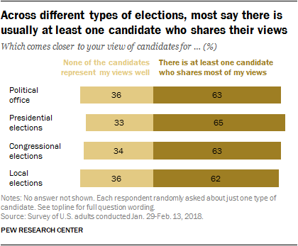 When asked generally about candidates for political office, 63% of Americans say there is usually at least one candidate who shares their views. That figure does not vary much when they are asked about specific offices: 65% say at least one presidential candidate usually represents most of their views, and 63% say the same about congressional candidates and 62% about candidates for local political office.