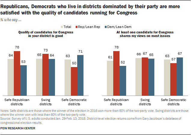 Among Democrats there is a similar, if less dramatic, pattern. About seven-in-ten (71%) living in heavily Democratic districts say the quality of candidates running in their districts is good, compared with 64% of Democrats who live in swing districts and 53% who live in predominantly Republican districts.