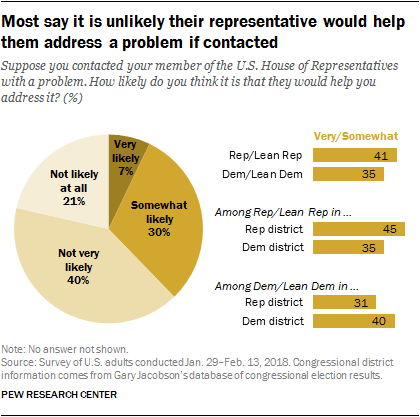 About six-in-ten Americans say that if they contacted their member of the U.S. House of Representatives with a problem it is either not very likely (40%) or not likely at all (21%) they would get help addressing it. Just 7% say their representative would be very likely to help, while 30% say this would be somewhat likely.