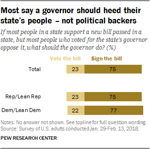 Three-quarters of Americans (75%) say that when a new bill is supported by a majority of people in a state – but opposed by the governor’s supporters – the governor should follow the will of the majority and sign the legislation. And while there are no differences between Republicans and Democrats in these views when the governor’s party is not specified, partisans’ answers do differ when the partisanship of the governor (and the governor’s supporters) is mentioned.