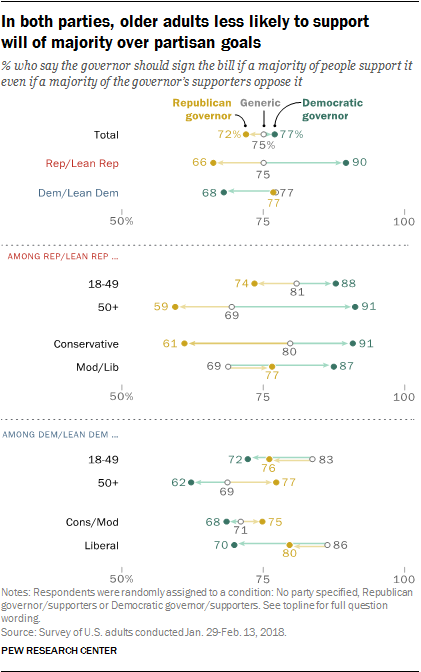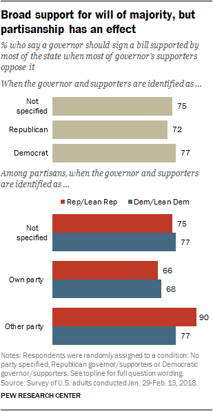 For example, when given no party reference, 75% of Republicans and Republican-leaning independents say the governor should follow the will of the majority, but when told that the governor is also a Republican and that Republicans oppose the bill, a narrower majority (66%) of Republicans say that the governor should sign the bill.