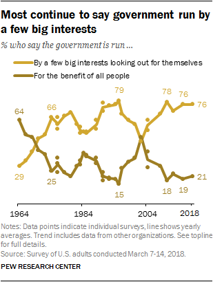 A large majority of Americans (76%) say the government is run by a few big interests looking out for themselves; fewer than a quarter (21%) say it is run for the benefit of all the people. Since the early 1970s, most Americans have generally said the government is run by a few big interests, and the share saying this is unchanged from 2015.