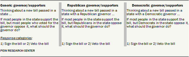 But partisans differ in their response to the example of a governor of the opposing party. Presented with an example of a bill on the desk of a Republican governor that is opposed by Republicans but supported by the majority of the state, the same share of Democrats say the governor should follow the will of the majority as say this when not provided any cues about the party of the governor or the governor’s supporters (77% in both cases).