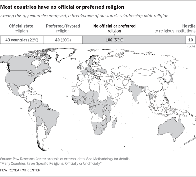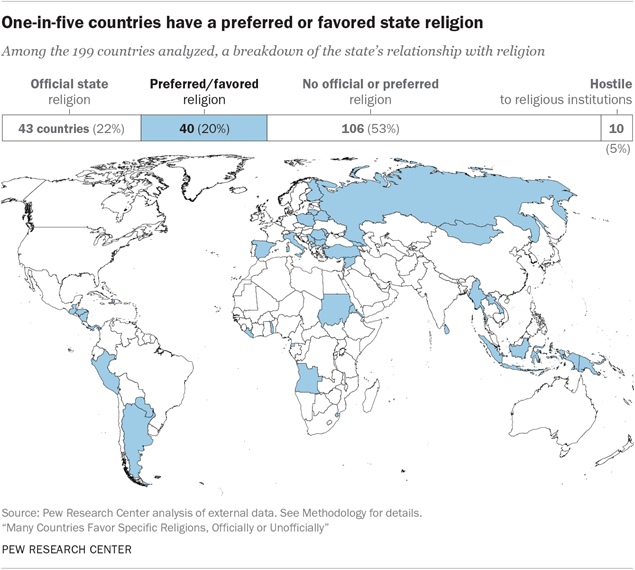 More than 80 countries favor a specific religion, either as an official, government-endorsed religion or by affording one religion preferential treatment over other faiths, according to a new Pew Research Center analysis of data covering 199 countries and territories around the world.1