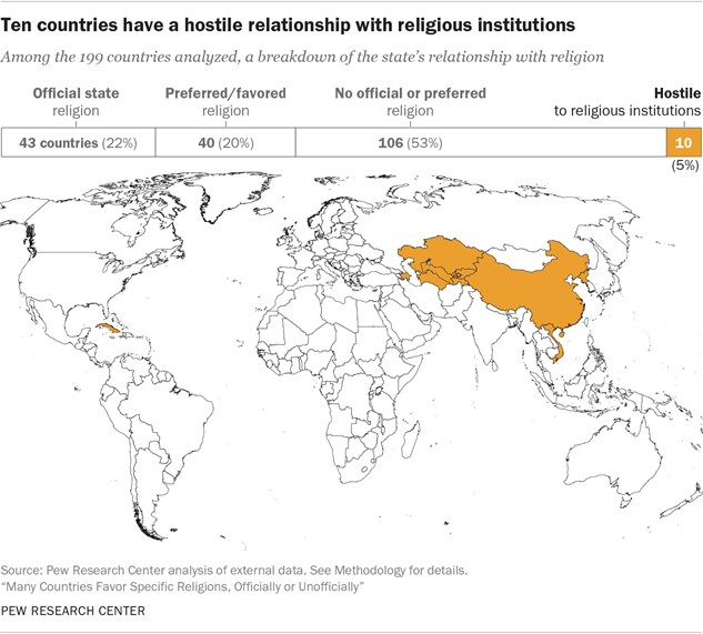 A small share of countries (5%) have no official state religion or preferred religion but nonetheless maintain a highly restrictive or hostile relationship with some or all major religious groups in the country, strictly regulating religious institutions and practices. These are Azerbaijan, China, Cuba, Kazakhstan, Kyrgyzstan, North Korea, Tajikistan, Turkmenistan, Uzbekistan and Vietnam.