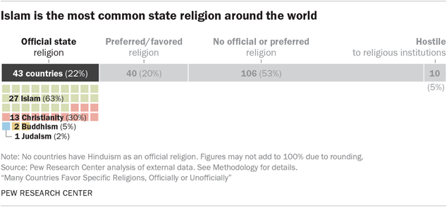 As of 2015, fully one-in-five countries around the world (22%) had declared a single state religion, typically enshrined in the constitution or basic law of the country.