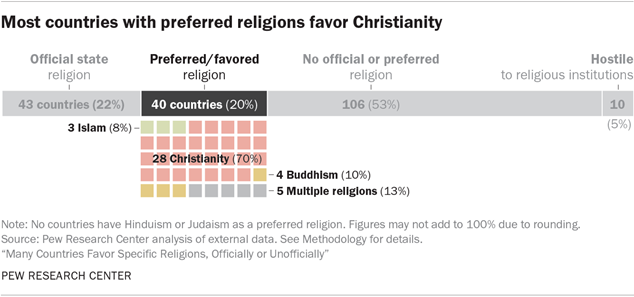But an additional 40 governments around the globe unofficially favor a particular religion, and in most cases the preferred faith is a branch of Christianity. Indeed, Christian churches receive preferential treatment in more countries – 28 – than any other unofficial but favored faith.