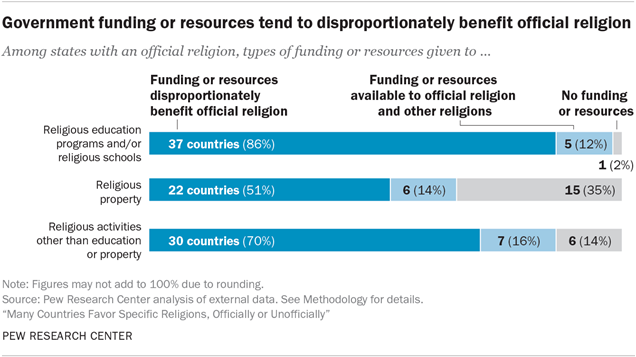 There also usually are financial benefits for official state religions. Among the 43 countries with an official religion, 98% provide funding or resources for educational programs, property or other religious activities.