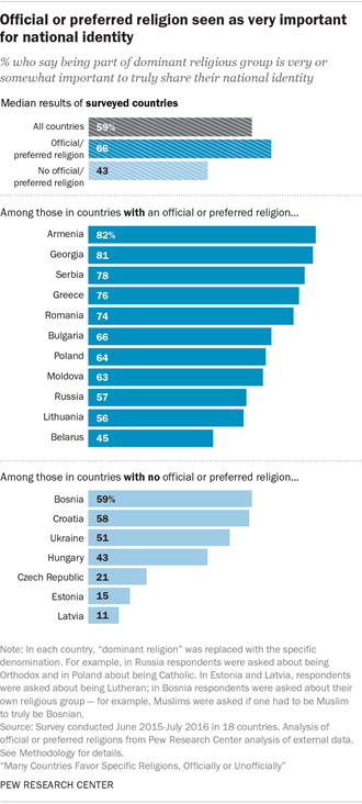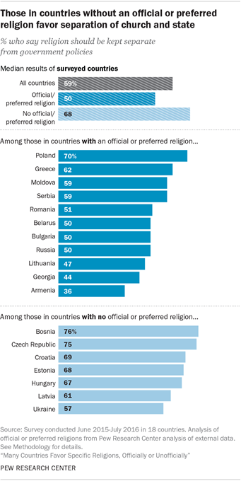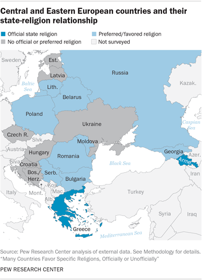 Pew Research Center’s recent survey of 18 countries in Central and Eastern Europe – covering most, but not all, of the region – included 11 countries with official or preferred religions (usually Orthodox Christianity) and seven with no official or preferred faiths.32