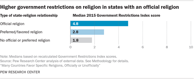 In some ways, states that have an official or preferred religion tend to behave differently from states that do not. Not only are they more likely to provide financial or legal benefits to a single religion, but they also are more likely to place a high level of government restrictions on other religious groups.