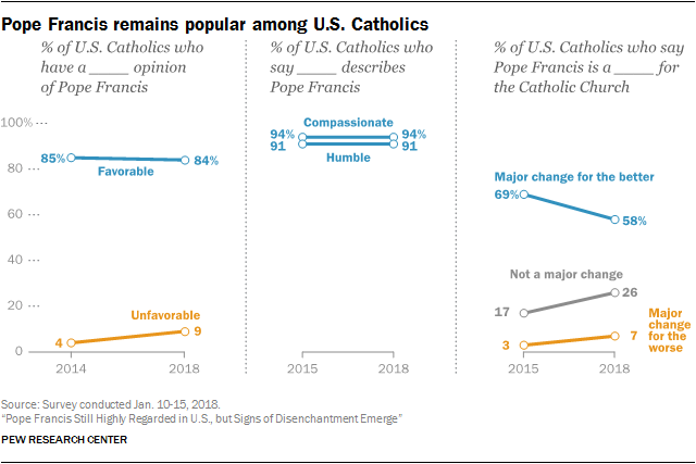 Currently, 84% of American Catholics say they have a “favorable” view of Pope Francis, which is virtually identical to the share who expressed a positive view of the pope after the first year of his pontificate. Furthermore, roughly nine-in-ten U.S. Catholics describe Pope Francis as “compassionate” and “humble.” And though the share of Catholics in the U.S. who think Pope Francis represents a “major change” for the better is down from a high point in 2015, nearly six-in-ten still express this view.