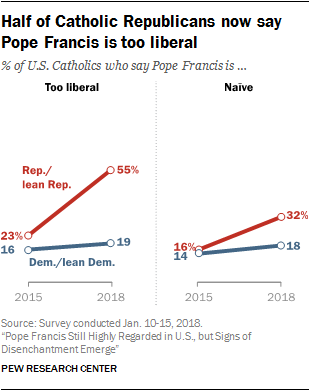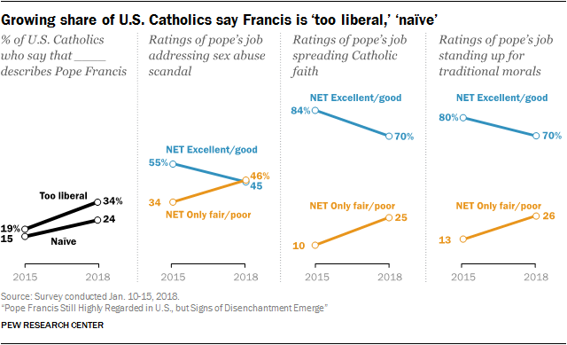 But while Francis remains quite popular, there are signs that American Catholics are less enamored with him than was once the case. For instance, the share of American Catholics who say Pope Francis is “too liberal” has jumped 15 percentage points between 2015 and today, from 19% to 34%. And about a quarter of U.S. Catholics (24%) now say he is naïve, up from 15% in 2015.
