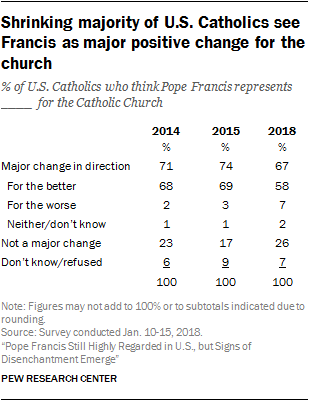 Five years into his papacy, most Catholics (67%) continue to say Pope Francis represents a major change in direction for the Catholic Church. This marks a slight decline since 2015 in the share who view the pontiff as a major change, with the decline concentrated among those who see Francis as a change for the better.