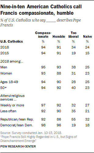 Over the same time period, however, there has been an uptick in the share who say the two negative descriptors apply to the pope. The share of U.S. Catholics who say the pope is “naïve” has increased since 2015, from 15% to 24% today. And about a third of U.S. Catholics (34%) say Pope Francis is “too liberal,” up from 19% who said this three years ago.