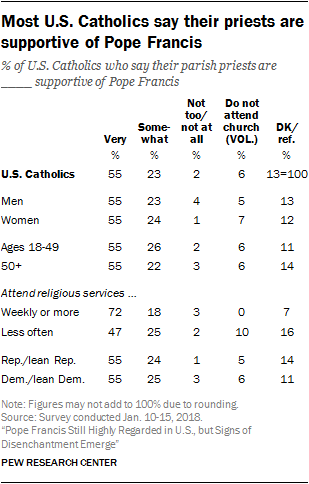 - Roughly half of Catholics (55%) say the priests at their parish are “very supportive” of Pope Francis, and an additional 23% say their priests are “somewhat supportive” of the pontiff. Roughly one-in-five self-identified Catholics decline to answer the question or else volunteer that they do not attend church often enough to assess the level of support for Francis among their parish priests. Just 2% say their priests are “not too” or “not at all” supportive of the pontiff.