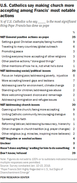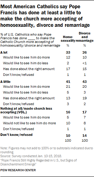 - Among U.S. Catholics as a whole, roughly three-quarters say the pontiff has done “a lot” (33%) or “a little” (41%) to make the Catholic Church more accepting of homosexuality. And seven-in-ten U.S. Catholics say Pope Francis has done “a lot” (26%) or “a little” (43%) to make the church more accepting of divorce and remarriage.