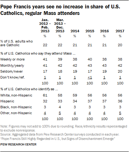 In 2012 and the first two months of 2013, before Francis became pope, 22% of U.S. adults identified as Catholics in Pew Research Center surveys. As of 2017, the Catholic share of U.S. adults stands at 20%, representing a very slight decline in the overall share of U.S. adults who are Catholic.