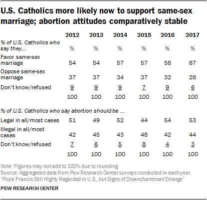U.S. Catholics also have steadily become more supportive of same-sex marriage over the years, and this has continued since Pope Francis assumed the papacy. In 2001, 40% of Catholics expressed support for allowing gays and lesbians to marry legally. By 2012, just before Francis’ election, the share of Catholics expressing support for same-sex marriage had grown to 54%, reflecting increased acceptance of same-sex marriage among the U.S. population writ large. As of 2017, fully two-thirds of Catholics say they favor allowing gay and lesbian couples to marry legally.