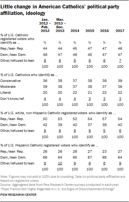 Just before Pope Francis assumed office, 44% of Catholic registered voters identified as Republican or said they leaned toward the GOP, and 48% of Catholic voters said they were Democrats or leaned toward the Democratic Party. Today those numbers are virtually unchanged. And the share of Catholics who identify as conservative, moderate or liberal on the political spectrum have been similarly stable.