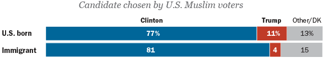 Immigrant Muslims are less likely than U.S.-born Muslims to say they cast ballots in the 2016 election (36% vs. 54%). However, among U.S. Muslim immigrants who are citizens (and therefore eligible to vote), 53% say they voted — virtually identical to the share among U.S.-born Muslims.