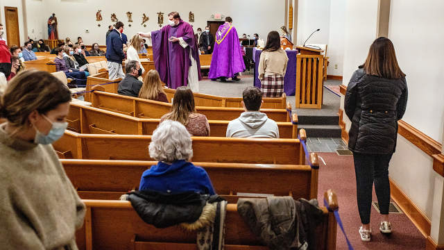 Father Mark Moore leads Ash Wednesday Mass at Christ the King University Parish, a Catholic church in Athens, Ohio, on Feb. 17. (Stephen Zenner/SOPA Images/LightRocket via Getty Images)