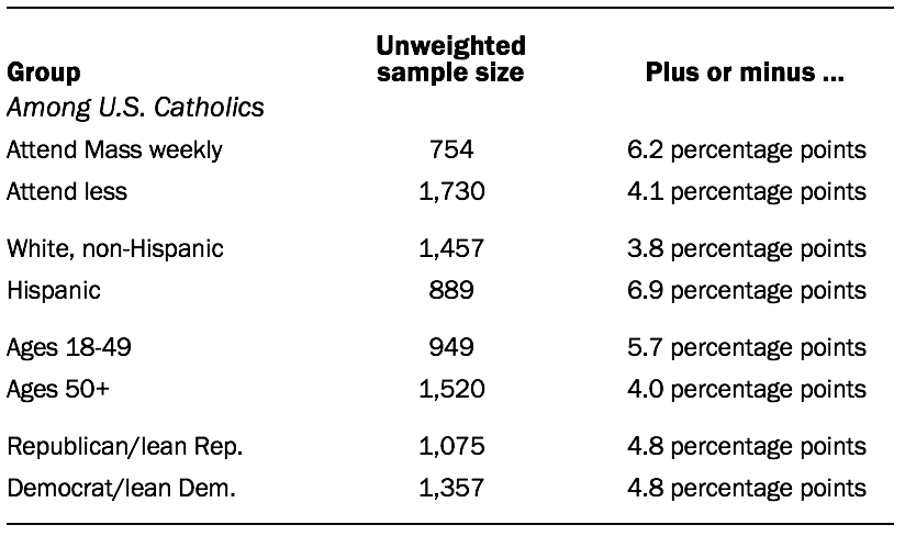 Sample sizes and sampling errors for other subgroups are available upon request. In addition to sampling error, one should bear in mind that question wording and practical difficulties in conducting surveys can introduce error or bias into the findings of opinion polls.