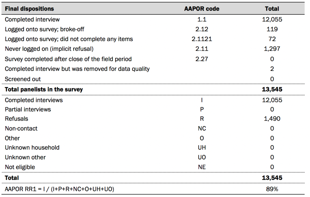 To ensure high-quality data, the Center’s researchers performed data quality checks to identify any respondents showing clear patterns of satisficing. This includes checking for very high rates of leaving questions blank, as well as always selecting the first or last answer presented. As a result of this checking, two ATP respondents were removed from the survey dataset prior to weighting and analysis.