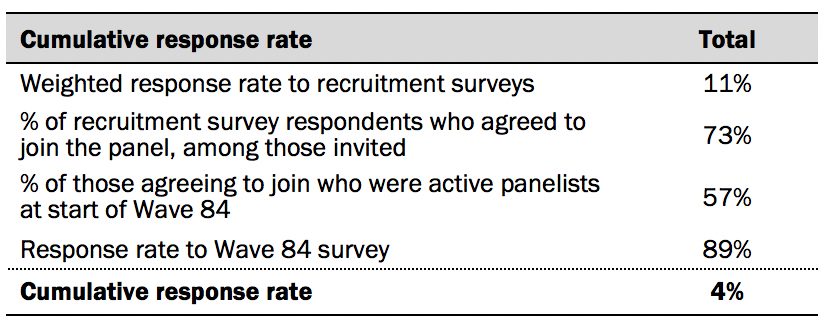 The U.S. Postal Service’s Delivery Sequence File has been estimated to cover as much as 98% of the population, although some studies suggest that the coverage could be in the low 90% range.3 The American Trends Panel never uses breakout routers or chains that direct respondents to additional surveys.