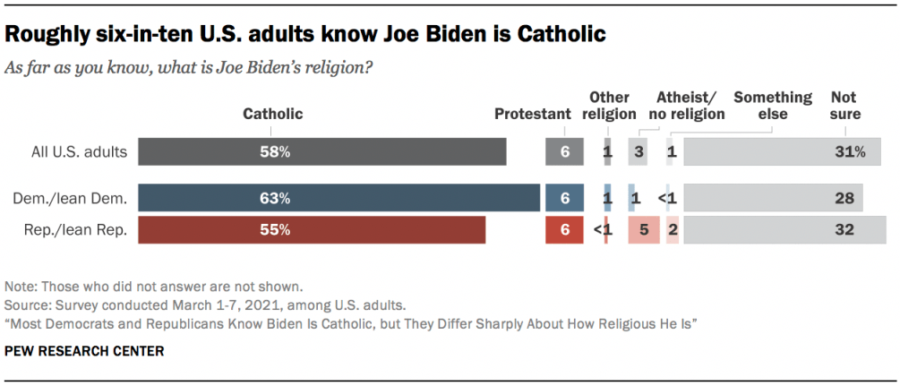Joe Biden is just the second Catholic president in U.S. history, after John F. Kennedy. Most U.S. adults know that Biden is Catholic, including majorities within both major political parties, according to a new Pew Research Center survey.