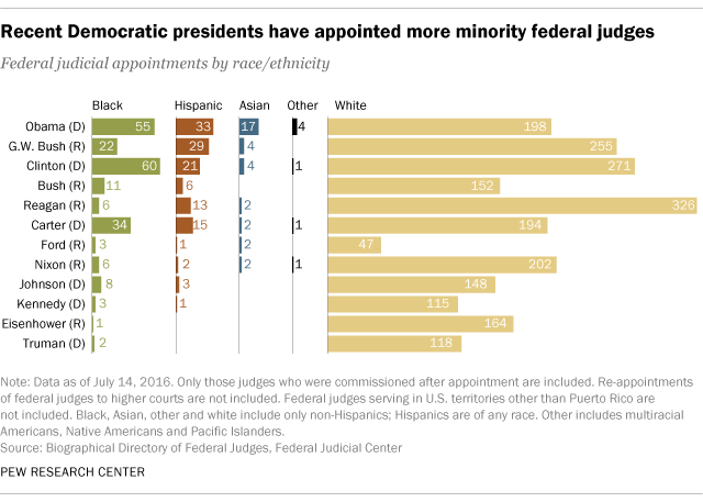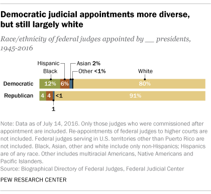 The number of minorities named to the federal courts has increased faster under Democratic presidents than Republican presidents. From 1945 to today – a period in which Republicans and Democrats have each occupied the White House for a total of 36 years – Democratic presidents have appointed three times as many black judges as their Republican counterparts (162 vs. 49). Democrats have also named more Hispanic judges to the federal bench (73 vs. 51). Still, eight-in-ten Democratic appointees have been non-Hispanic whites, compared with nine-in-ten Republican appointees.