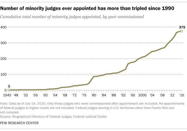 Seven-in-ten minority judges who have served on the federal bench were appointed in the last 25 years. In fact, the cumulative number of minorities to have ever served in the district and appellate courts has more than tripled since 1990, according to a Pew Research Center analysis of Federal Judicial Center data for the U.S. and Puerto Rico. This growing diversity also is apparent at the federal court system’s highest level: the U.S. Supreme Court. While only three minority judges have ever served on the Supreme Court – including Thurgood Marshall (1967-1991), Clarence Thomas (1991-present), and Sonia Sotomayor (2009-present) – two of them are currently serving.