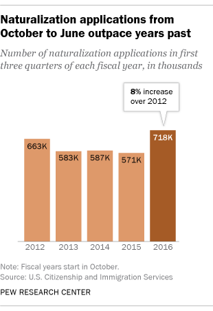 The number of legal permanent residents applying for U.S. citizenship in the nine months starting last October is at its highest level in four years, and it is up 8% from the same period before the 2012 elections. Although some organizers of naturalization and voter registration drives have suggested the increase is a reaction to Donald Trump’s candidacy, a Pew Research Center analysis of naturalization data shows there have been much larger percentage increases in past years, with jumps not always coming during election years.