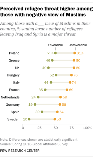 Negative views of refugees are tied to negative views about Muslims. In all 10 EU countries surveyed, people who have a more negative view of Muslims are also much more concerned about the threat of refugees to their country. For example, in the UK, 80% of those who have an unfavorable opinion of Muslims say refugees leaving Iraq and Syria are a major threat to their country. Most refugees in Europe come from nations that are predominantly Muslim.