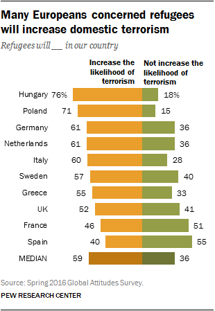Many Europeans are concerned that the influx of refugees will increase the likelihood of terrorism and impose a burden on their countries. A median of 59% across 10 EU countries voice concern about the prospect of increased terrorism. This includes 76% who say this in Hungary and 71% in Poland. Around six-in-ten in Germany (61%), the Netherlands (61%) and Italy (60%) also think refugees will increase terrorism in their country. (The survey was conducted prior to terrorist attacks in France and Germany that occurred over the summer.)