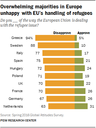 Regardless of whether they see refugees as a threat, or whether they think they increase terrorism, crime or take jobs, Europeans overwhelmingly believe that the European Union is doing a poor job of handling the refugee crisis. Majorities in every country surveyed say they disapprove of how the EU is handling refugees, including a staggering 94% of Greeks and 88% of Swedes.