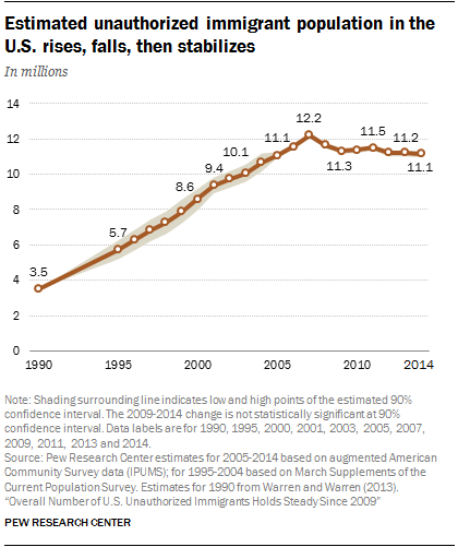 An estimated 11.1 million unauthorized immigrants lived in the U.S. in 2014, according to a new Pew Research Center estimate based on government data. This population has remained essentially stable since 2009 after nearly two decades of changes.