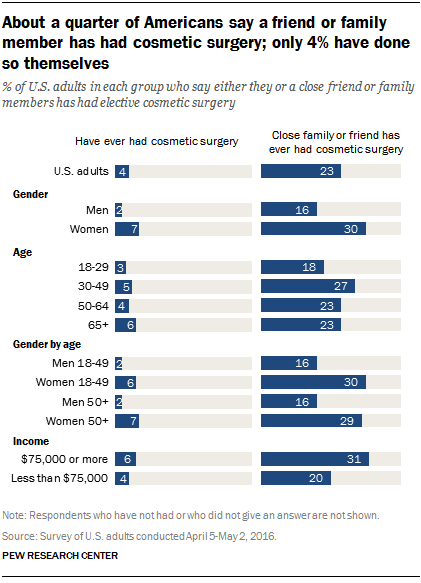 Some 23% of U.S. adults say a close friend or family member has had elective cosmetic surgery. As with personal experiences, women are more likely than men to say a friend or family member has done this. Knowing someone who has had cosmetic surgery also varies by income: About one-in-three adults whose household income is $75,000 or more a year report they have a close friend or family member who has done this, compared with 20% of those whose annual household income falls below $75,000.