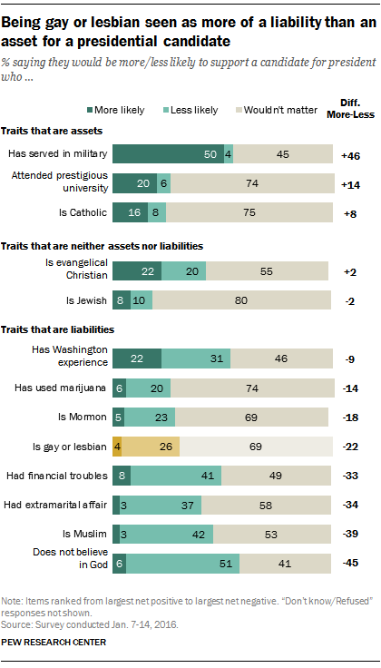 Oregon Democrat Kate Brown, who is bisexual, made history on Election Day by becoming the first openly lesbian, gay, bisexual or transgender (LGBT) person to be elected governor anywhere in the U.S. But while a growing number of LGBT politicians have been elected to public office and attitudes toward the LGBT community have become much more favorable over the past decade, survey data suggest that being gay or lesbian remains somewhat of an obstacle for candidates running for president.