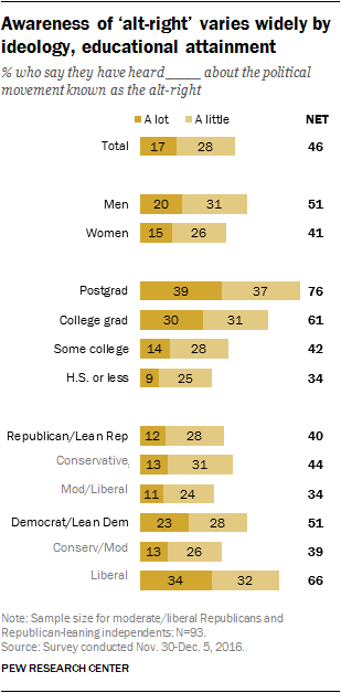 Most college graduates (61%) also have heard at least a little about the alt-right, but there is less awareness of the movement among those with some college experience but no degree (42%) and those with no more than a high school education (34%).