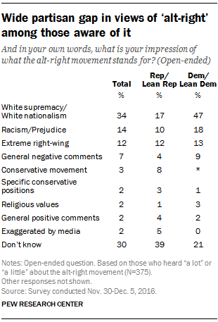 Among those who say they have heard “a lot” or “a little” about the alt-right, roughly a third (34%) associate the movement with “white supremacy” or “white nationalism.” That was the most common answer provided in an open-ended question asking respondents about their impressions of what the movement stands for, ahead of “racism” or “prejudice” (14%) and “extreme right-wing movement” (12%).
