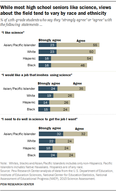 A majority of high school seniors in the U.S. say they enjoy science and around four-in-ten (44%) would like to have a job in the field, according to a Pew Research Center analysis of the 2015 National Assessment of Educational Progress (NAEP). These sentiments, however, tend to vary by race and ethnicity – a pattern that also is reflected in American students’ test scores in science.
