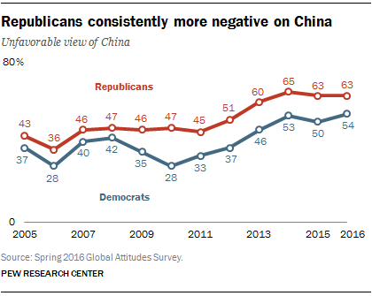While it remains to be seen whether President Donald Trump will act on campaign promises to get tough on Beijing, the American public has largely soured on China in recent years. In a January survey by Pew Research Center, 65% said China is either an adversary (22%) or a serious problem (43%), while only about a third (31%) said China is not a problem. And in a separate spring 2016 survey, a majority (55%) of Americans held an unfavorable opinion of their largest Asian rival.