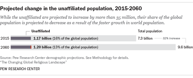 To be clear, the total number of religiously unaffiliated people (which includes atheists, agnostics and those who do not identify with any religion in particular) is expected to rise in absolute terms, from 1.17 billion in 2015 to 1.20 billion in 2060. But this growth is projected to occur at the same time that other religious groups – and the global population overall – are growing even faster.