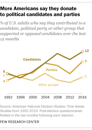 Americans are increasingly likely to make political donations, with the share of adults who say they have donated directly to candidates doubling since 1992, according to data from American National Election Studies (ANES). Political donations from individuals represent a large share of campaign funding: In the 2016 election cycle, 71% of Hillary Clinton’s fundraising total and 40% of Donald Trump’s came from individual contributions, according to the Center for Responsive Politics.