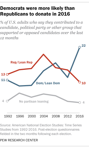 Democrats were twice as likely as Republicans to say they donated last year. In 2016, 22% of Democrats and Democratic leaners and 10% Republicans and Republican leaners reported making a donation, according to data from ANES. This marks the first election since at least 1992 when Democrats have been significantly more likely than Republicans to donate.