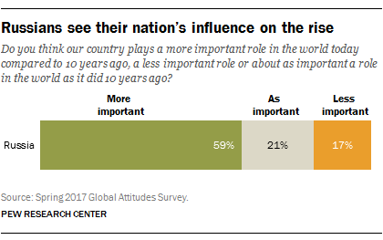 A majority of Russians believe their country is playing a more important role in the world today than it did a decade ago. Other publics with a sense of growing global importance include China and India. In a spring 2016 survey,